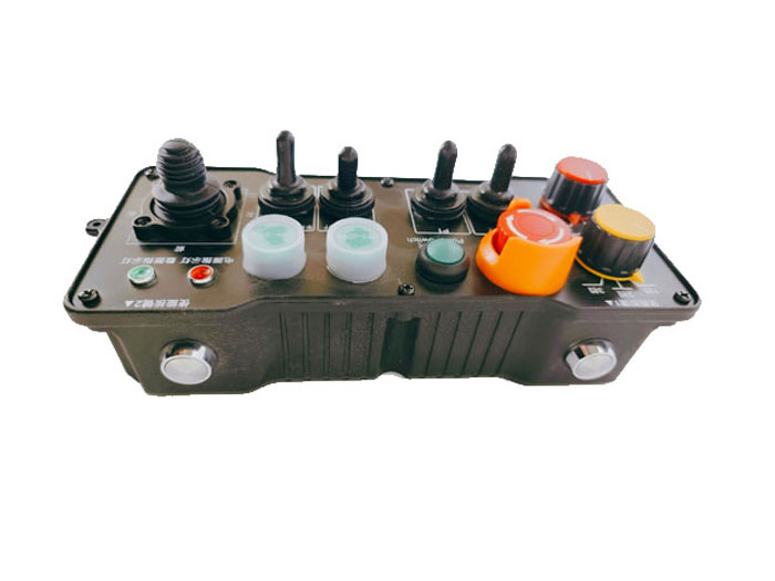 左邊前后2個(gè)輪子視為一個(gè)驅(qū)動(dòng),右邊前后2個(gè)輪子視為1個(gè)驅(qū)動(dòng),針對(duì)左右兩驅(qū)動(dòng),各布局1個(gè)三位自復(fù)位扭子開關(guān);油門加減速布局1個(gè)電位器控制;汽油機(jī)的啟動(dòng)和熄火,布局為2個(gè)按鍵控制,點(diǎn)動(dòng)模式,且兩者互鎖邏輯,對(duì)應(yīng)接收器端2路繼電器輸出。