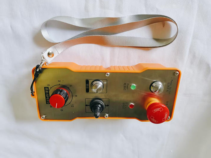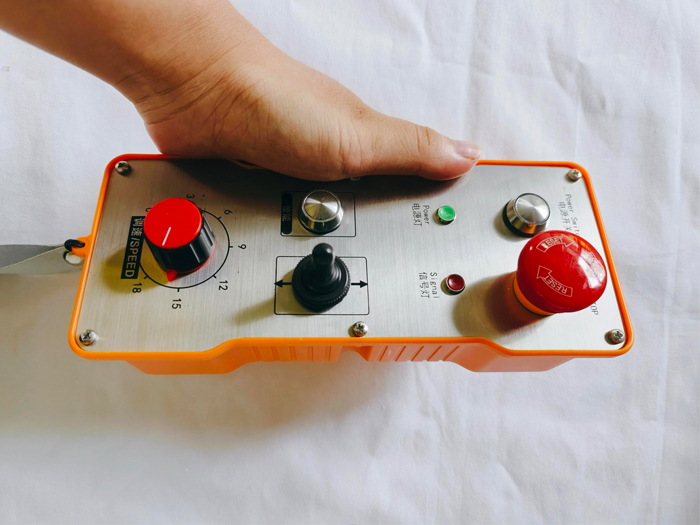 2路開關量1路模擬量調速工業(yè)遙控器,1個三位自復位扭子開關,標識為上下直線箭頭,1個調速旋鈕(調速/SPEED),常規(guī)增大減小標識(不帶中文),“使能(ENABLE)”按鍵1個,啟動(START)、急停(STOP),電源指示燈(POWER)、信號指示燈(SIGNAL);